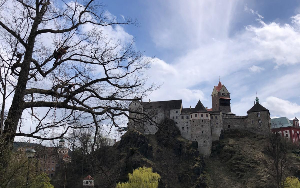 Ošetření dubů nad amfiteátrem ve městě Loket bezpečnostní a redukční řezy na dubech vyrůstajících na skalce nad amfiteátrem města Loket řezy zaměřené na zajištění provozní bezpečnosti stromu redukce větví rostoucích nad pěší stezkou spouštění větví nad dřevěným altánkem