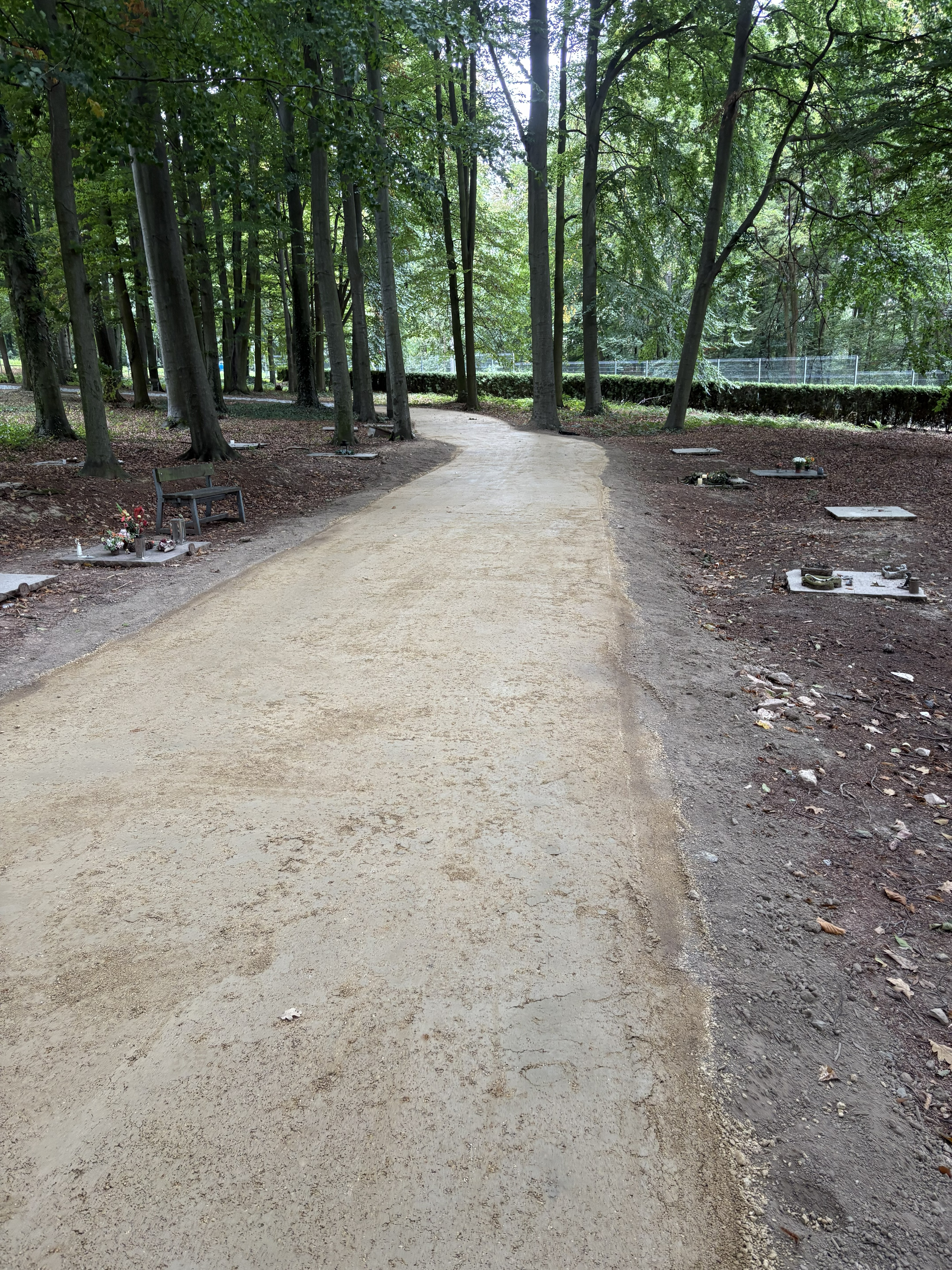 - Pietní charakter:Jako výplň jsme zvolili kombinaci materiálů (kamene a mlatu), který vizuálně splývá s okolím, čímž zůstal zachován pietní charakter celého místa.
