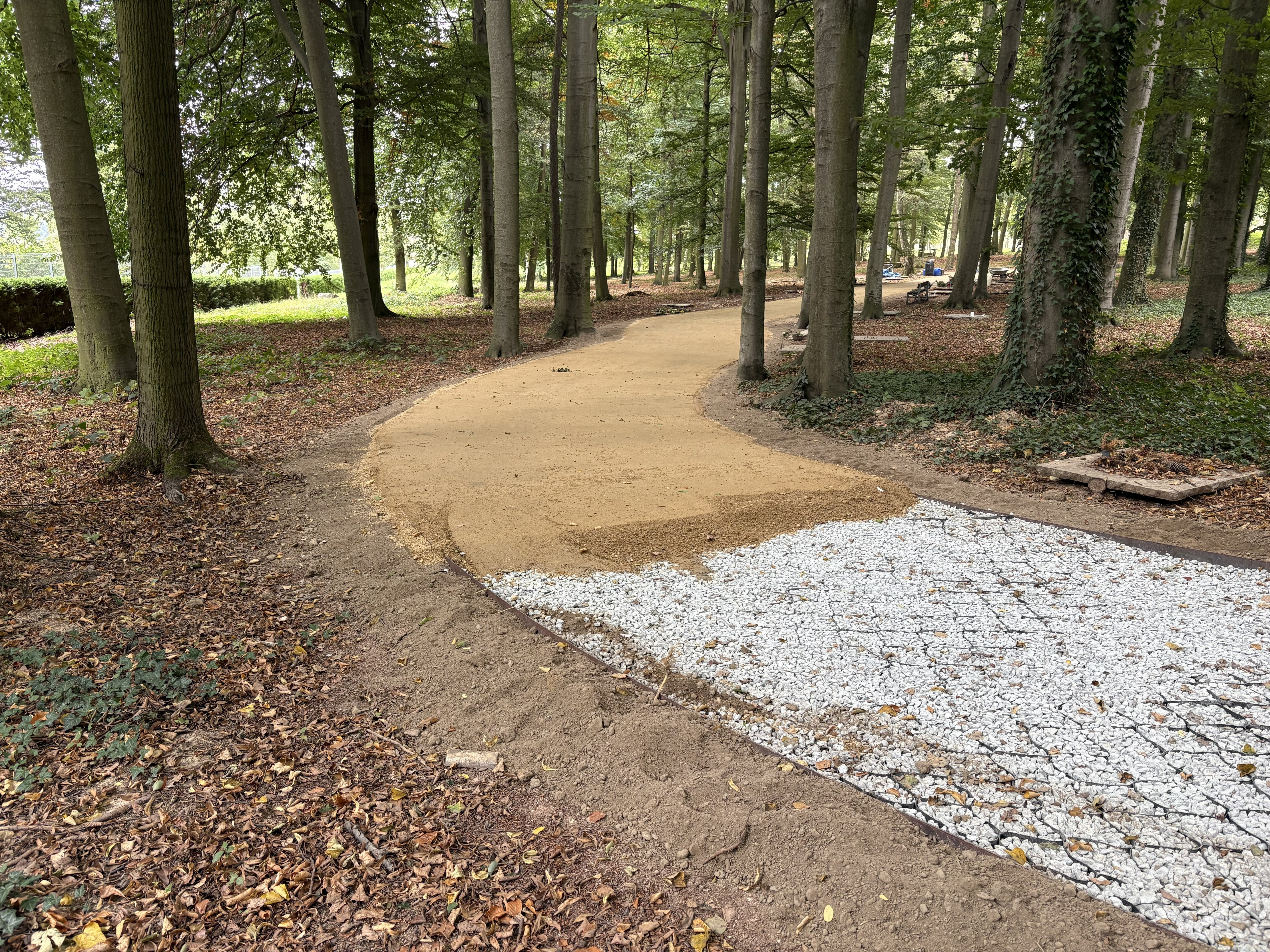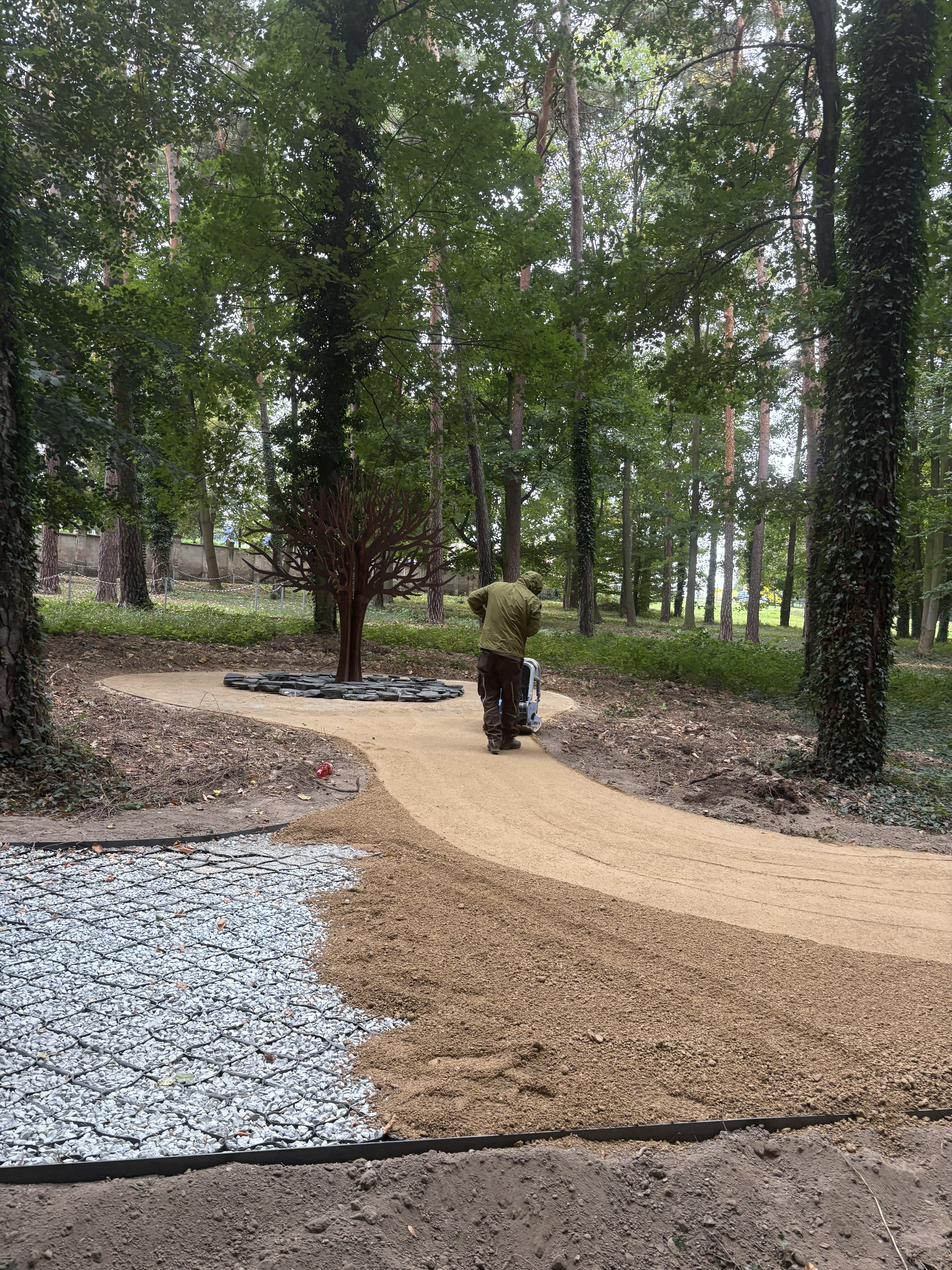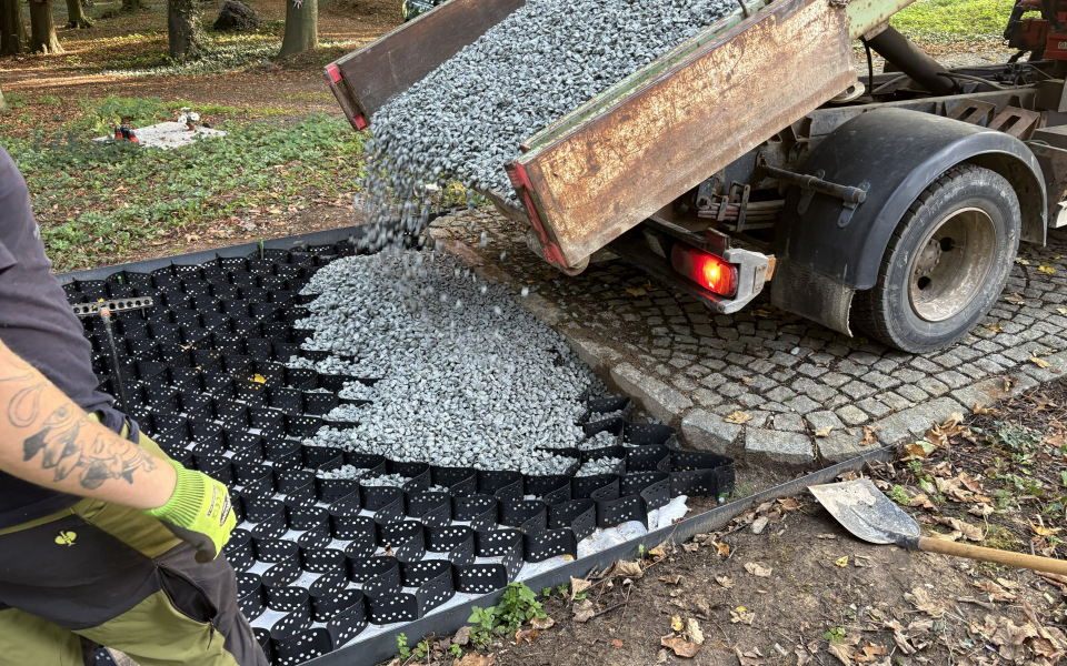 Na tomto místě jsme kladli velký důraz na ochranu kořenového systému stromů, jelikož cesty vedou v jejich těsné blízkosti. Geobuňky zde byly jasnou volbou z několika důvodů: