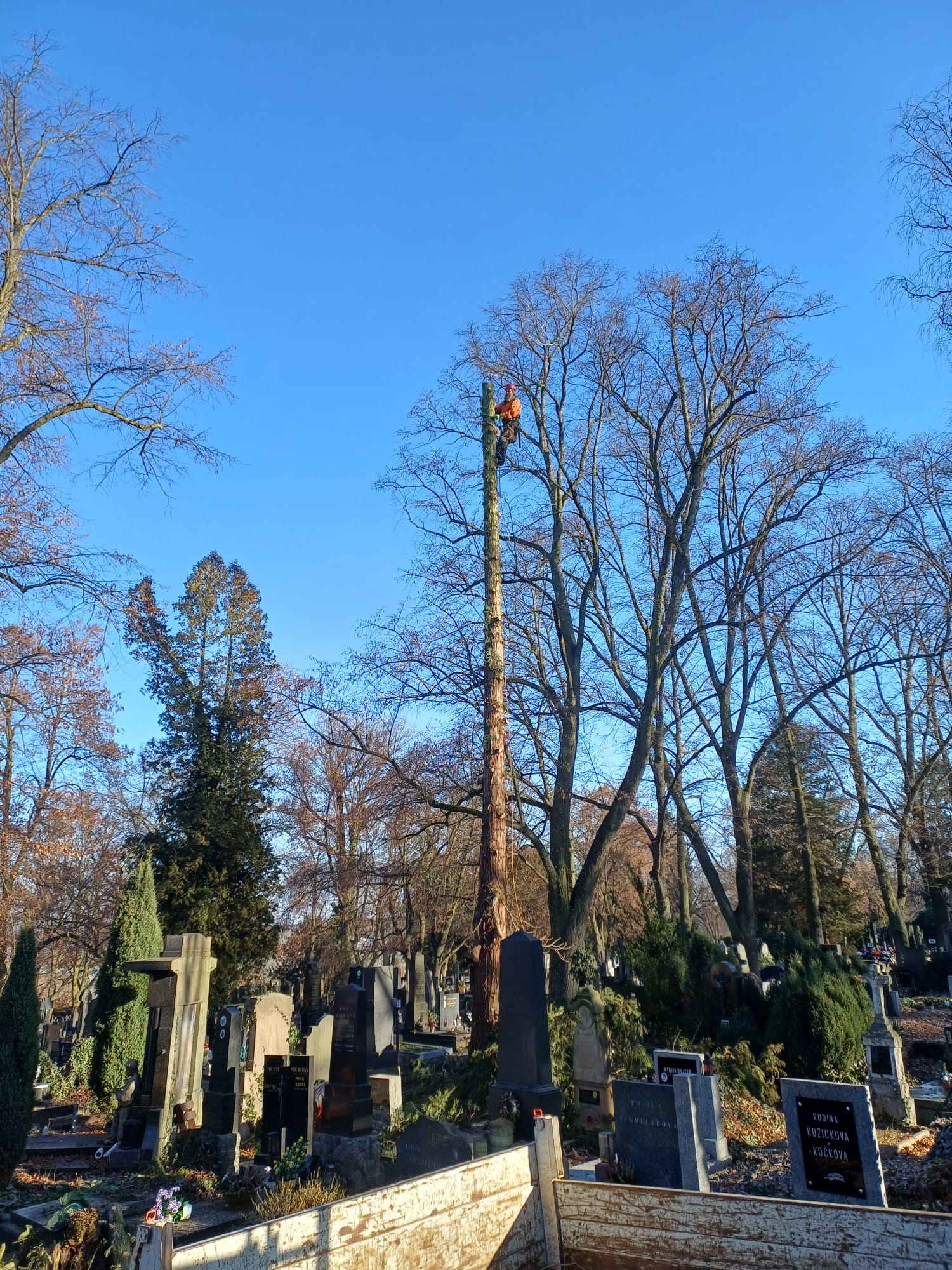 - Postupné kácení stromu pomocí stromolezecké techniky na Ústředním hřbitově v Plzni
