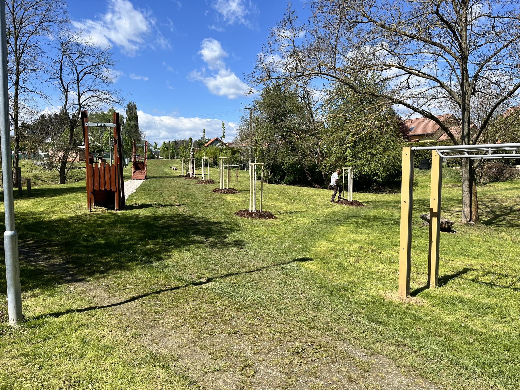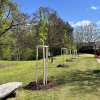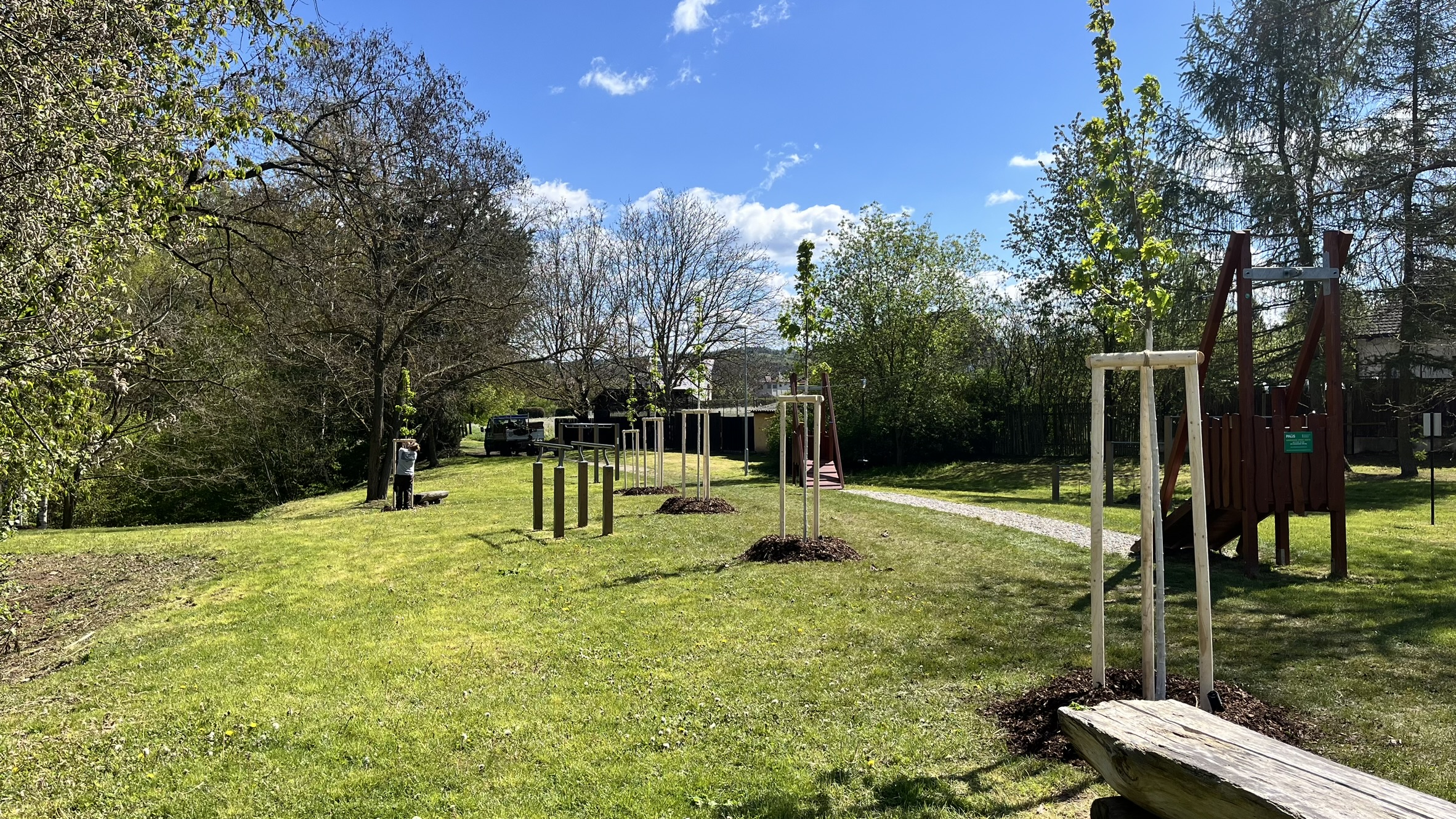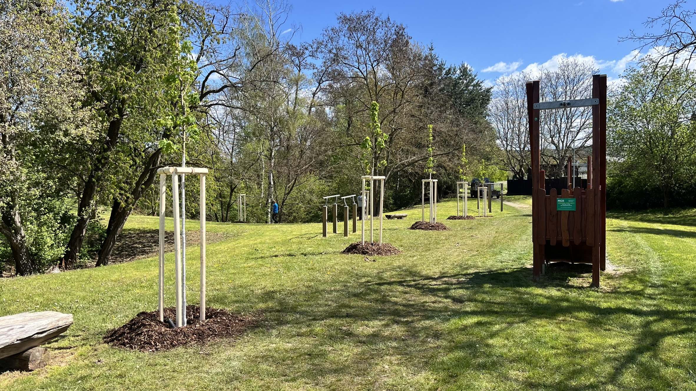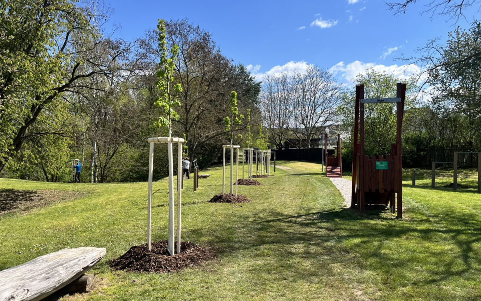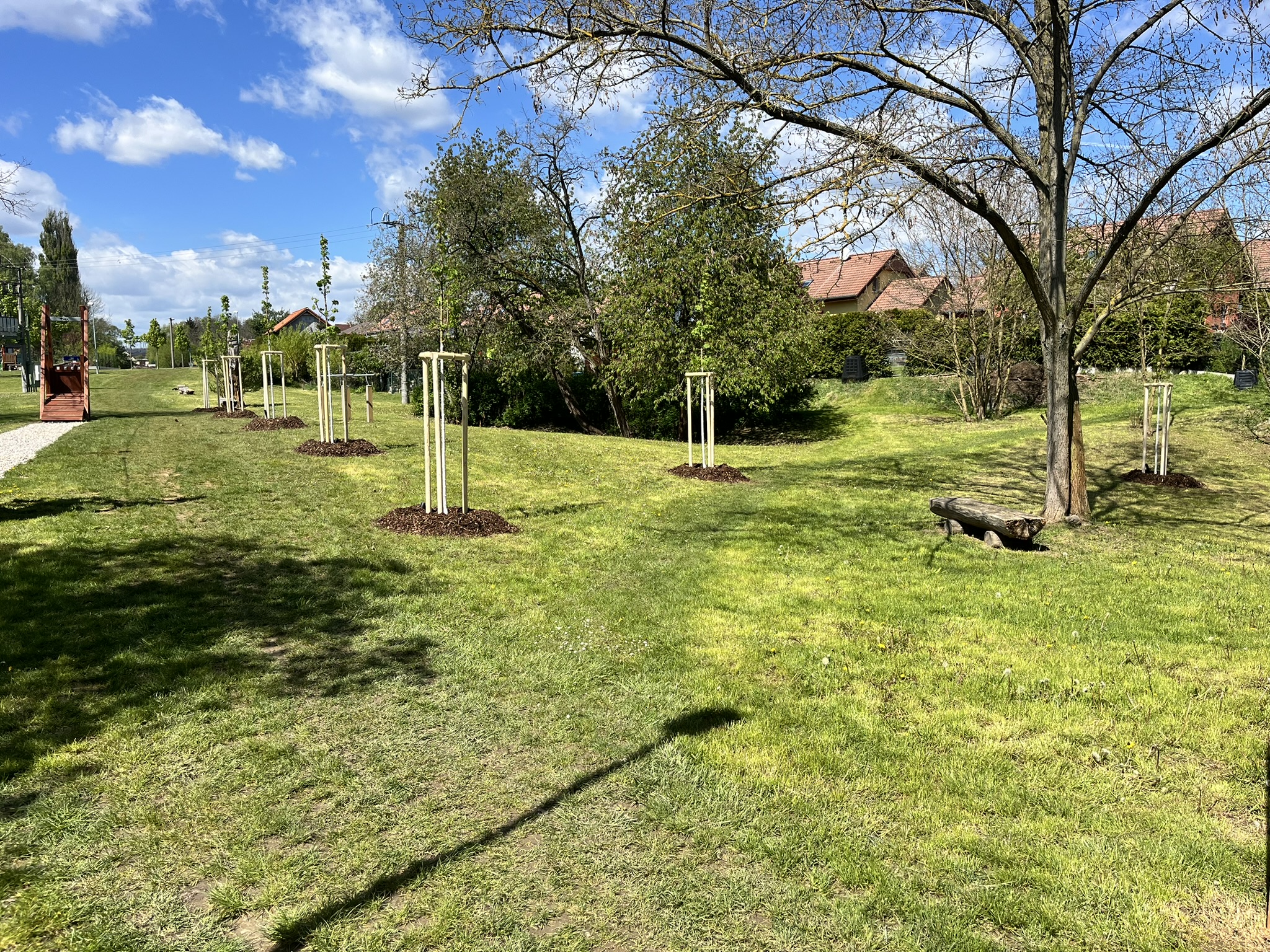 Výsadba stromů v obci Dýšina Výsadba dřeviny s balem Zřízení závlahové sondy Kotvení dřeviny třemi kůly s úvazkem Aplikace hydrogelu Nátěr kmene Flexskin Mulčování drcenou borkou